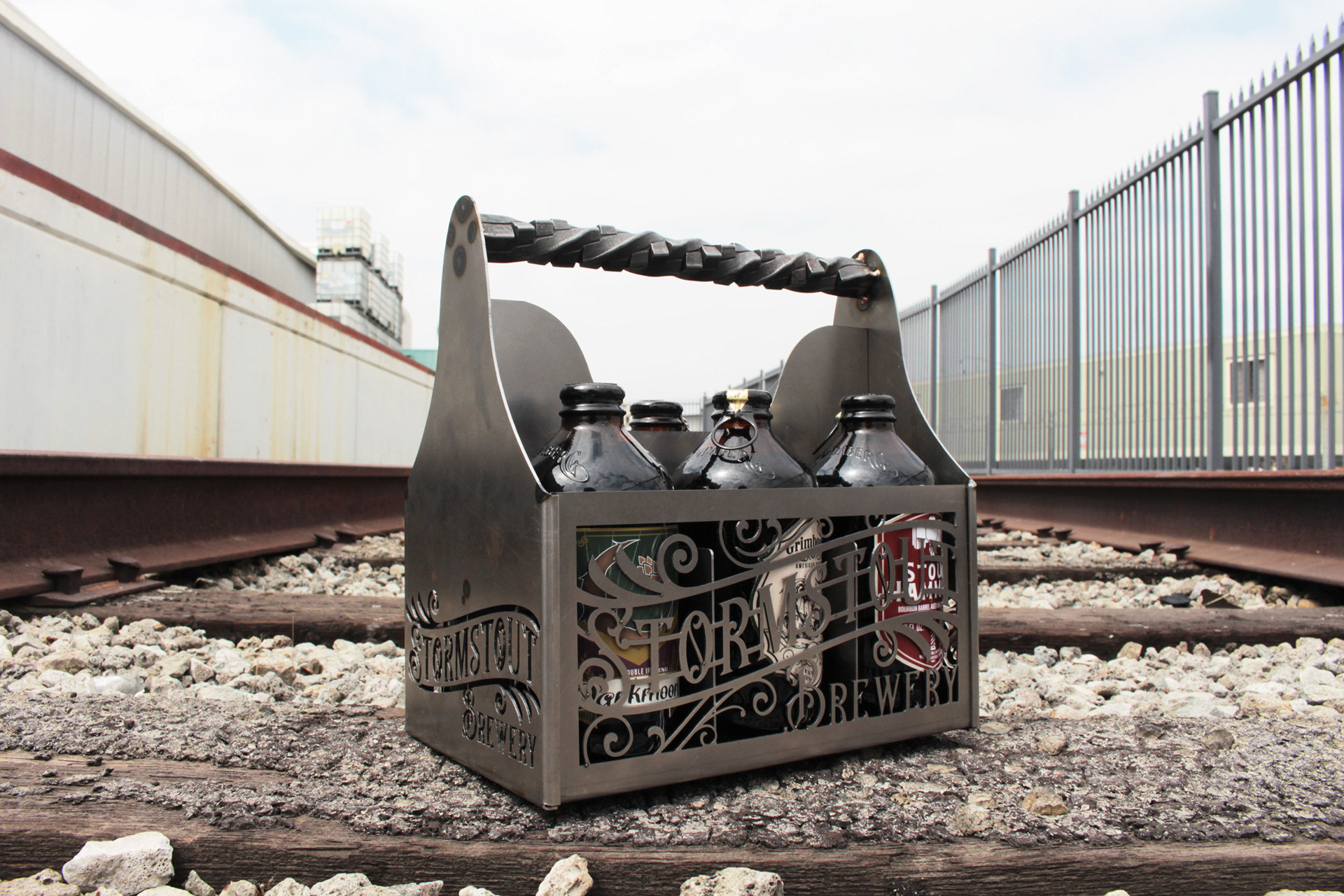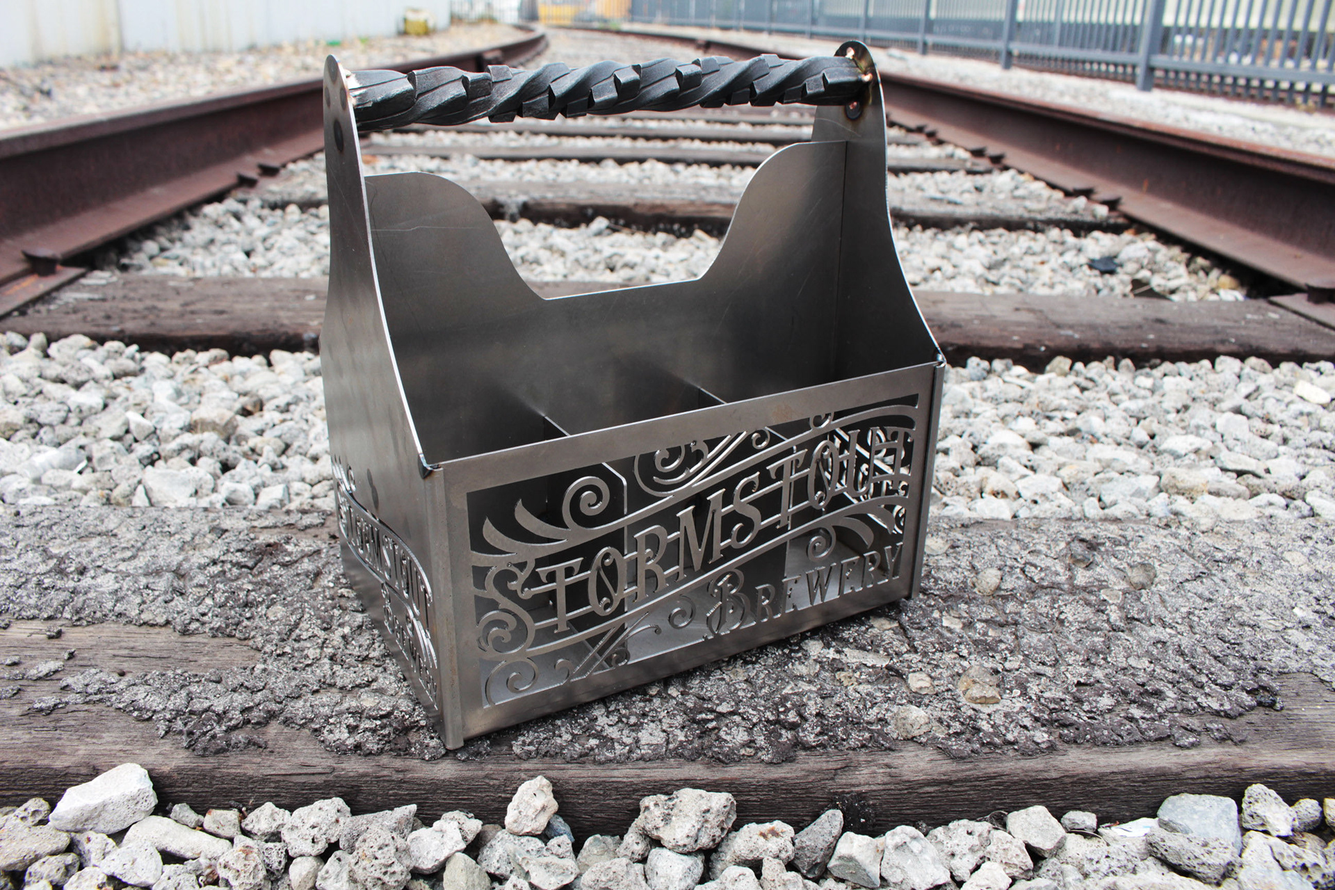 Created a six pack sampler for a brewery. Its lazer cut out of 18 Gauge steel and welded together. The handle is a hand forged Rubik's Twist bar also made from steel. Each bottle has a different label designed and adhered to it.